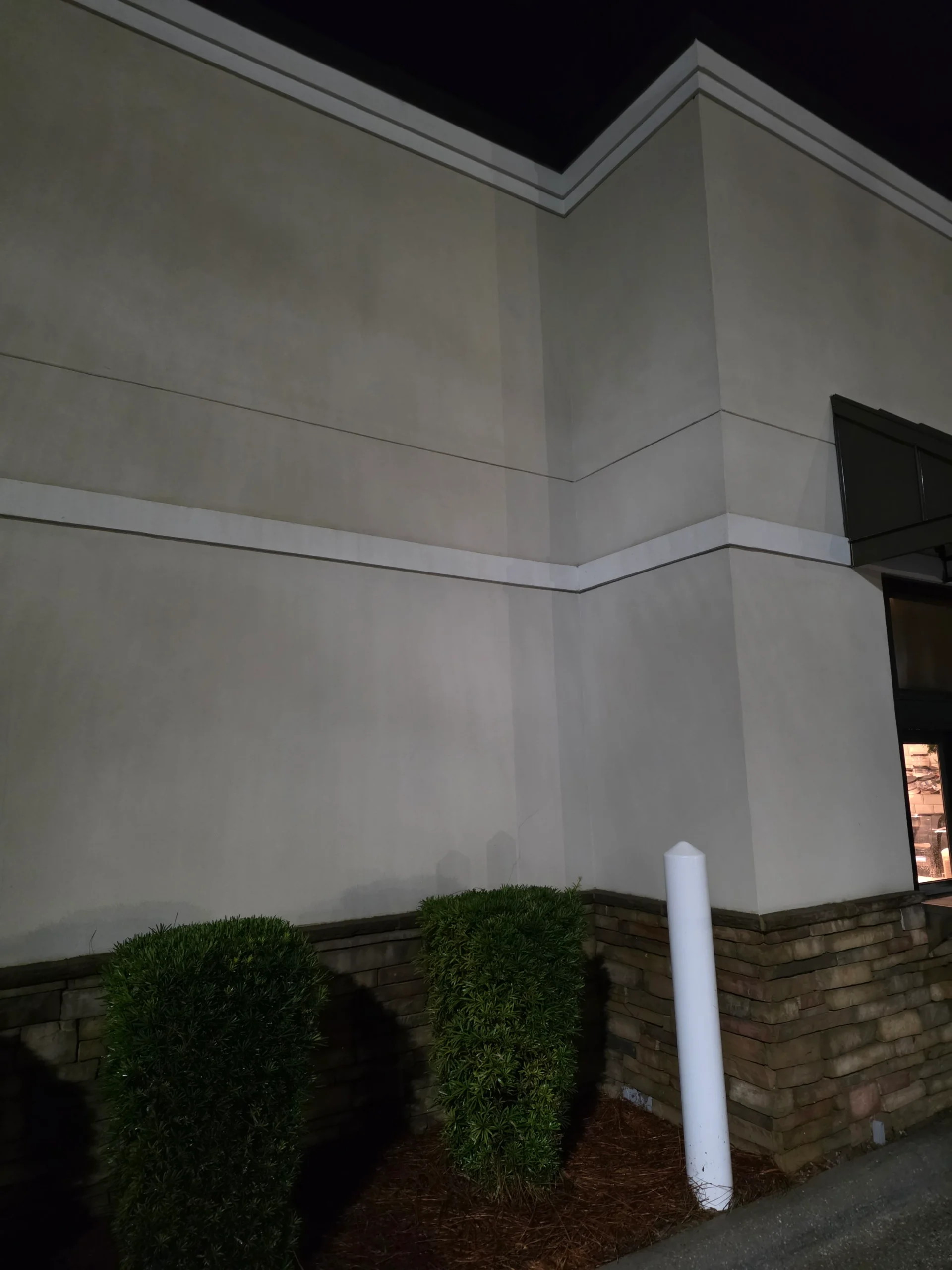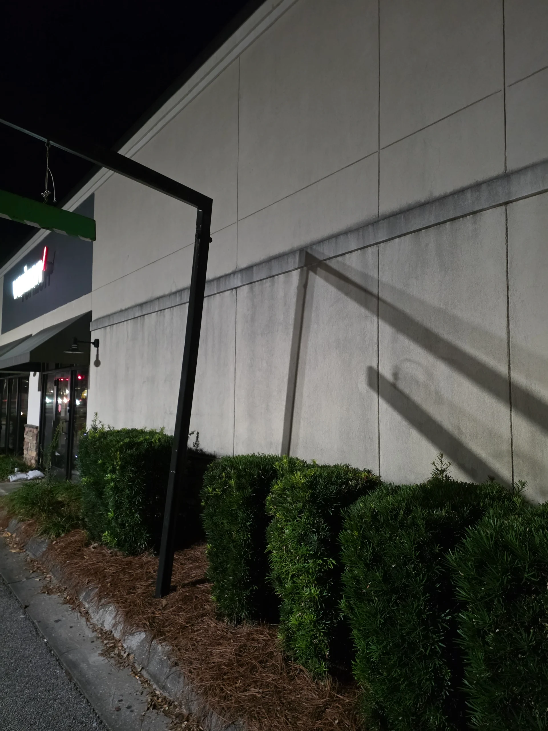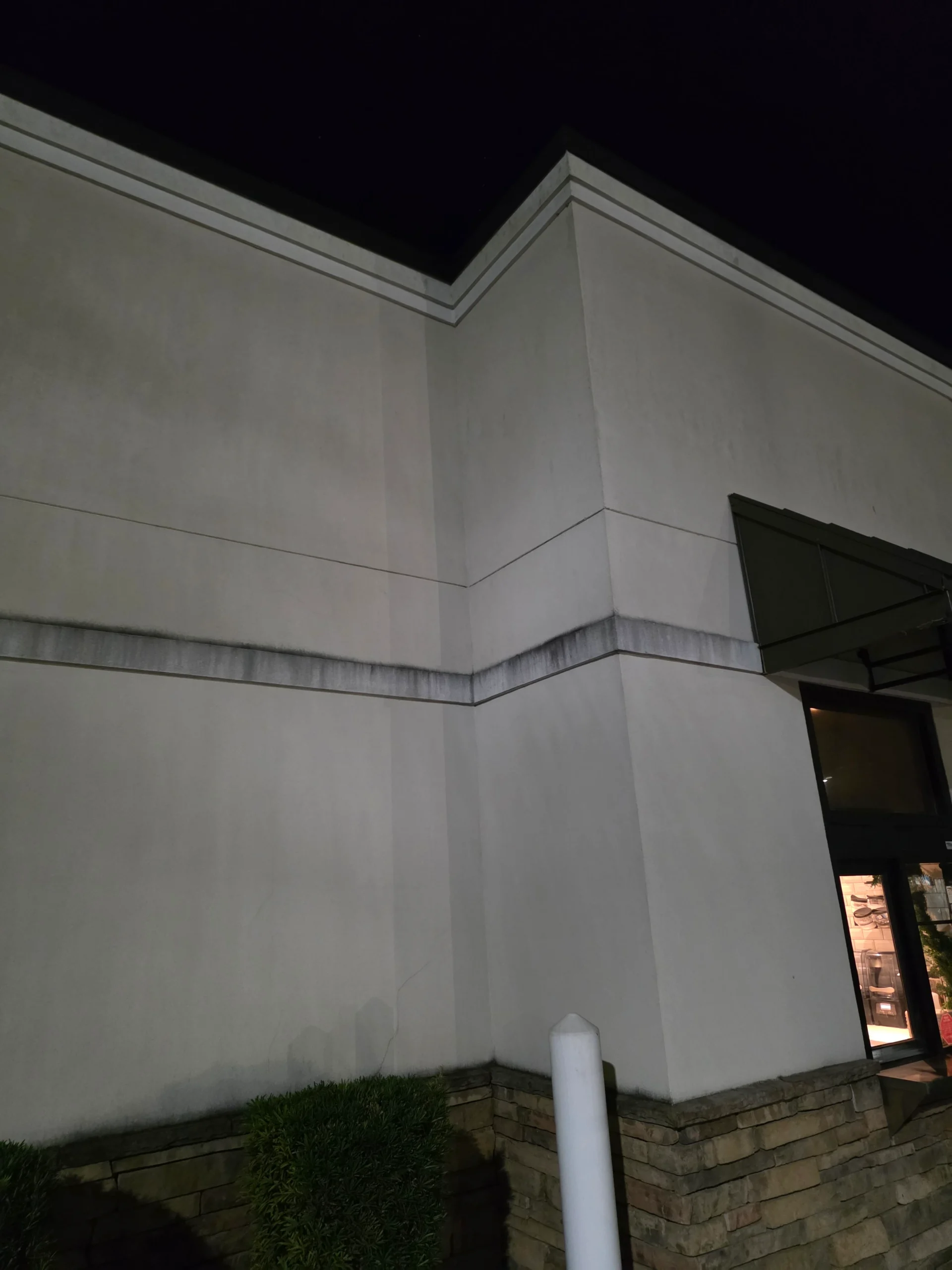 We used a dedicated soft wash system with calibrated metering for a professional sodium hypochlorite and surfactant blend, applied at low pressure to protect paint, stucco, signage, and window seals. For the concrete, we deployed a commercial-grade 4,000 PSI pressure washer, a 20-inch surface cleaner, targeted wands for edging, and hot-water capability to break down grease, oils, and gum efficiently.